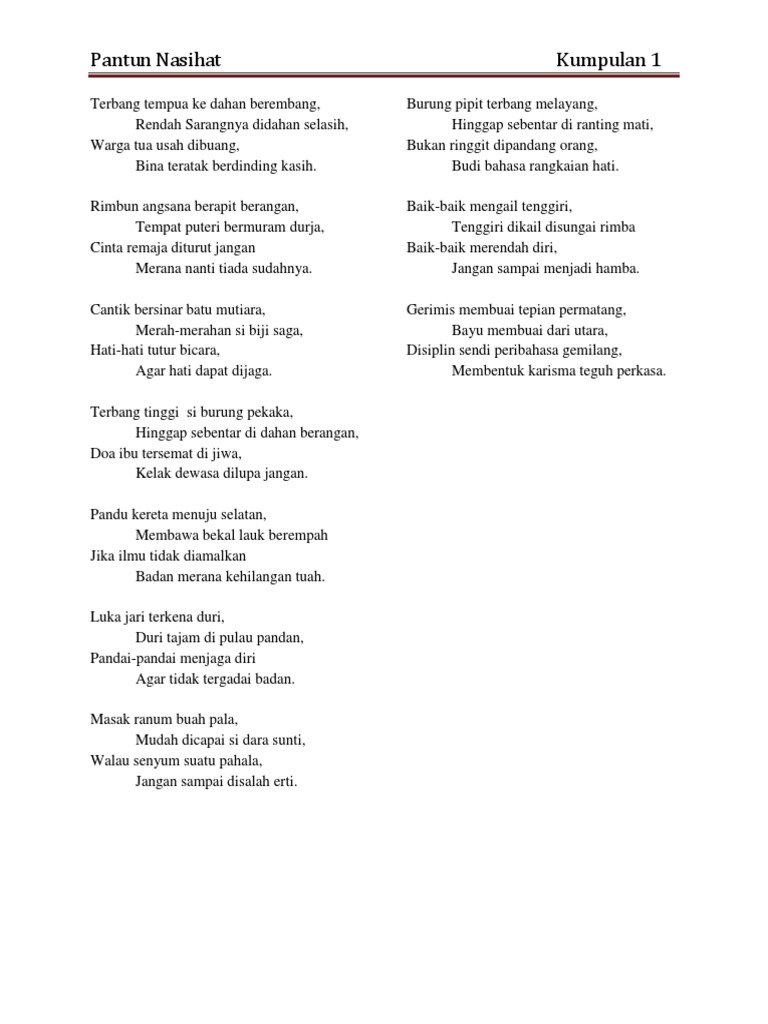 Aspirasi negara mencapai wawasan 1Malaysia wahana perpaduan. Pantun nasehat adalah salah satu cara menegur yang halus. Catatan ini hanyalah sekadar untuk mengingatkan diri saya dan semua agar kita sentiasa mengingati bahaya yang mungkin menimpa kita di dunia dan di akhirat kelak.