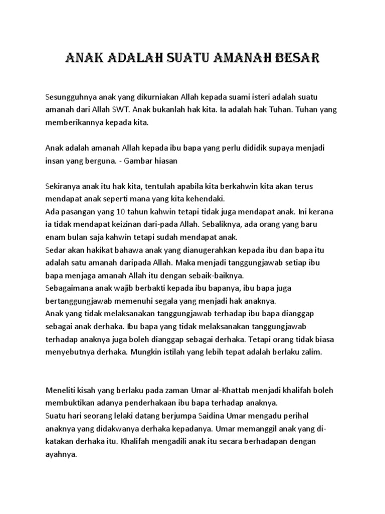 Pertama jika dia memilih isteri yang tidak solehah untuk meletakkan beinhnya ke dalam rahim wanita tersebut. Tazkirah ini bertajuk IBU BAPA DERHAKA yang disampaikan oleh Ustaz Khairul Nizam B. Begitulah Saidina Umar meletakkan kesalahan kepada si bapa lantaran kecuaiannya dalam mendidik anaknya sendiri.