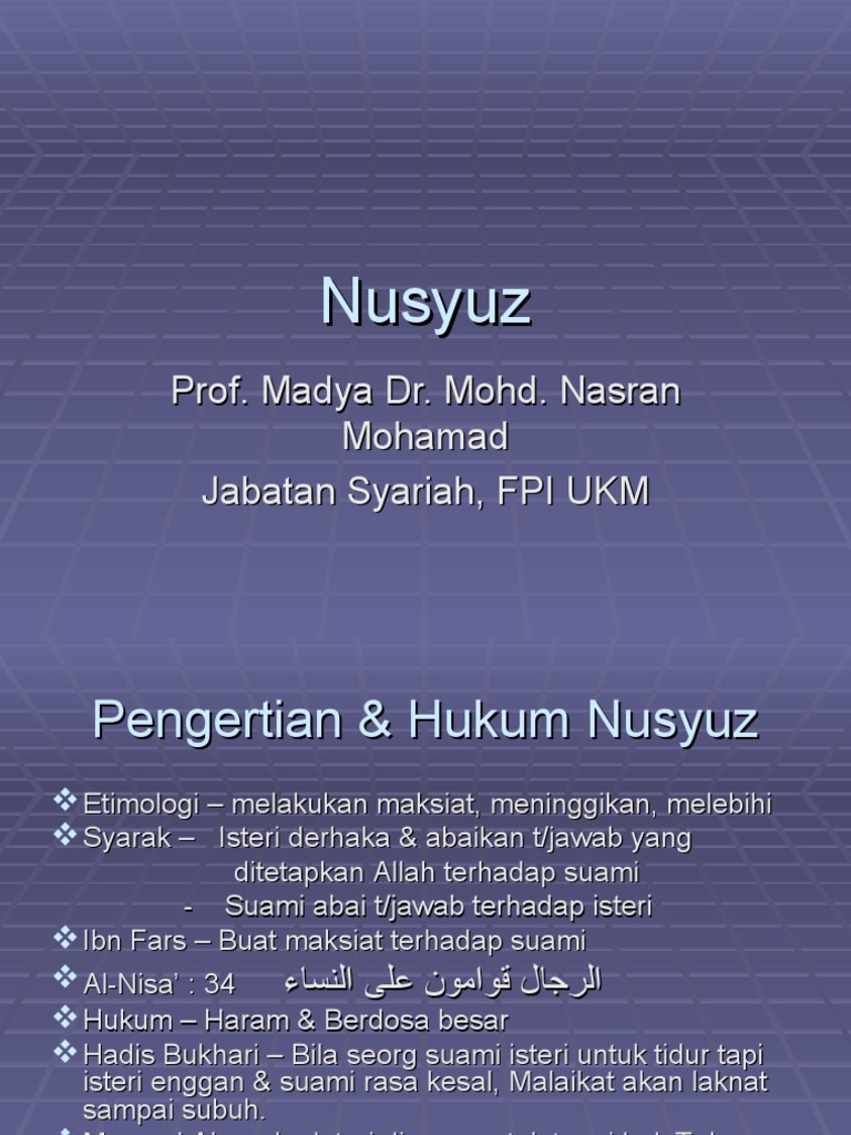 Bila nasihat baik bolih jadi nusyuz isteri jawap nusyuz hanya mahkamah yg bolih jatuhkan nusyuz ke tak. Jika ada para isteri yang tidak menunaikan tanggungjawabnya kepada suami dengan sebaik-baiknya dan menganggap tanggungjawab terhadap suami itu hanya membebankan dan menyusahkan dirinya maka isteri yang sedemikian itu dikhuatiri termasuk di dalam kategori isteri yang menderhaka atau nusyuz. Kemudian aku bertanya lagi.