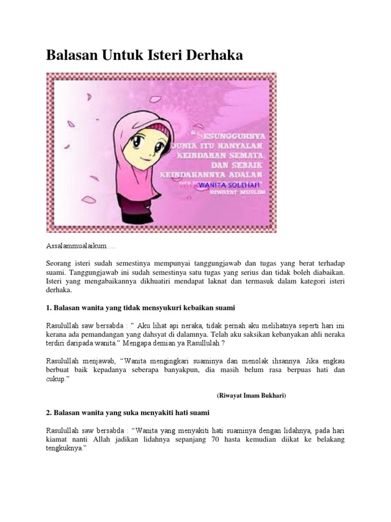BALASAN KELAK DI AKHIRAT Masalah ini bisa menimbulkan perbalahan dan pergaduhan lebih besar sehingga sesetengahnya berakhir dengan perceraianDalam hal ini terkadang isteri bersikap agresif sehingga meninggi suara membantah dan melawan kehendak suaminya tanpa sebab munasabah mengikut hukum syarak. Balasan Kerana Derhaka Kepada Suami. ISTERI DERHAKA HIDUP DALAM KEADAAN SENTIASA DILAKNAT DI DUNIA INI SEHINGGA MENDAPAT KEAMPUNAN SUAMINYASemual amal ibadah dan.
